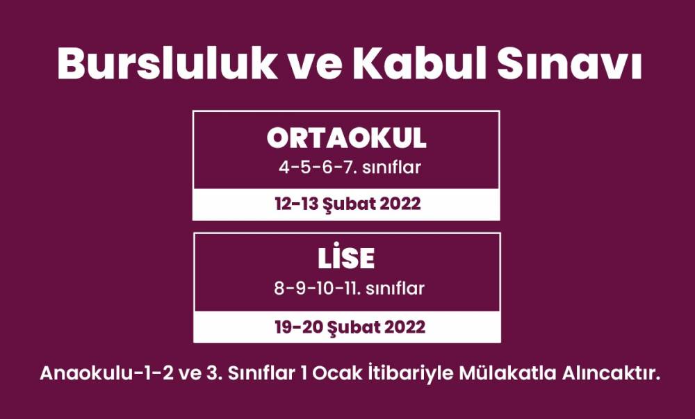 Asrın Marmara Koleji Çekmeköy Kampüsüne; 2022-2023 Eğitim-Öğretim yılı için Anaokulu,1-2-3.sınıflar 1 Ocak itibarıyla mülakatla,4-5-6-7-8-9-10-11.sınıflar ise belirlenen tarihlerde ''Bursluluk ve Kabul Sınavı '' ile alınacaktır.